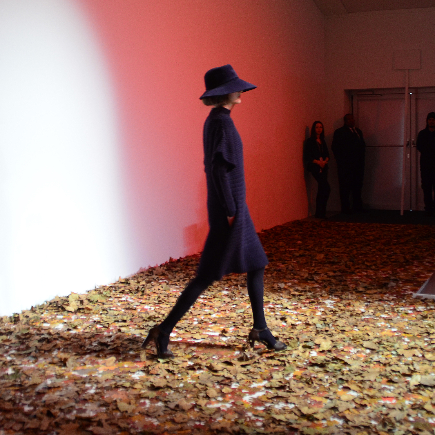 An odd medium, people walked in and around the models, whilst a fantastic display of electricity filled the pyramid ceiling, the cast of movement against the stationary collection seemed similar to a television of static. The collection had a Italian influenfce against long silk and leather and slight fur, I keep seeing this from design to design and the correlation between fabric to length challenging generic ideas of dress length in a colour palette that reflected the room, cool hints of blue, purple and charcoal with some, but very little red.